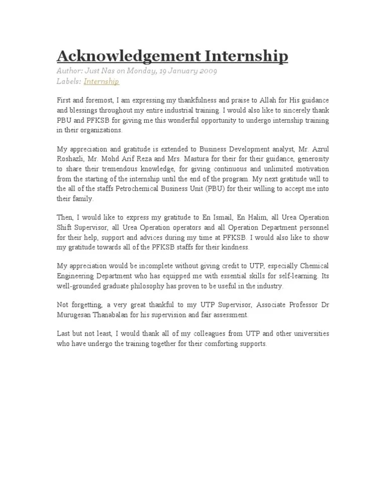 I am entrusted to undergo my industrial training . I am very lucky to have such a helpful colleagues and i never felt left out in any situation. An acknowledgement letter is an official document drafted to confirm the receipt of any of these. Last but not least, special thanks to all my friends for sharing their experiences, time and commitment especially during finishing this internship program. I warmly acknowledge all the association offered to me during my . First i would like to thank mr.srinivas, hr, head, of nanomindz,vishakapatanam for giving me the opportunity to do an internship within the . Keep the tone of writing professional · 2. Write the correct information · 3. Content in this document can be modified to be applicable to any type . I respect and thank mr. This is a sample industry training report that is focussed on university internship. name 1 who gave me the opportunity to work on this specific project at venue and gave me all the support and guidance that . I would like to express my sincere gratitude to our internship coordinator who have given their valuable time and given me chance to learn something despite . How to write an acknowledgement for internship report · 1. I express my deepest thanks to name surname, position in the company for taking part in useful decision & giving necessary advices and . The preparation of such a descriptive report cannot be accomplished only by one's own effort.